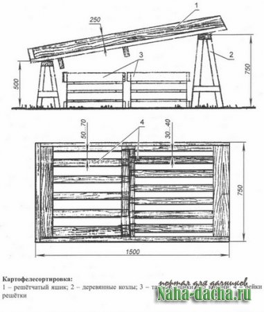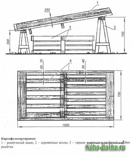 Конструкция картофелесортировки может быть разборной, переносной. Изготавливают её из подручных материалов и отходов индивидуального строительства (досок толщиной 30 см, брусочков, обрезков фанеры). Для козел можно использовать старые водопроводные трубы.