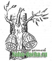 ловушка для насекомых. Бутылка разрезается на две части и обе заполняются паклей (годится также старая вата или даже сухой мох), которая фиксируется слирапьно согнутой стальной провопокой. В начале осени такие ловушки вешаются на дерево, как это показано на рисунке. Весной пакля вытряхивается и сжигается вместе с зимующими в ней насекомыми-вредителями.