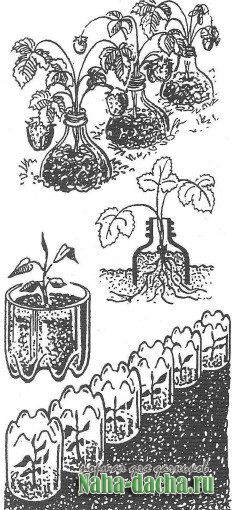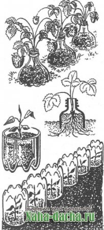 Мосхвичка М. Листратова вот уже несколько лет высаживает рассаду в обрезанные верхние части пластиковых бутылок, заполненные удобренной земляной смесью и частично углубленные в почву. Ухаживать за растениями не в пример легче, а полноценных ягод с такой грядки можно собрать гораздо бопьше, чем с обычной.