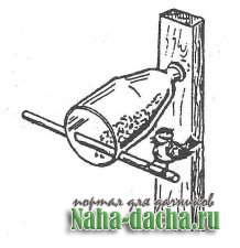 кормушек для птиц. И в этом случае пригодится пластиковая бутылка - нужно только отрезать у нее дно и закрепить папочку-насест, как это показано на рисунке. Ну а чтобы навесить такую кормушку, нужно пишь в деревянной стойке просверлить коловоротом отверстие диаметром чуть меньше, чем диаметр горлышка, и натуго ввернуть в него бутылку.