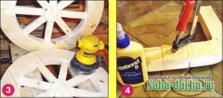 4. Ножки тележки сборные. Выпилите по две детали ноги. Нанесите разметку пазов для углового соединения вполдерева. Пропилите боковые стороны пазов, стамеской выдолбите паз. Нанесите клей, прижмите детали друг к другу струбцинами.