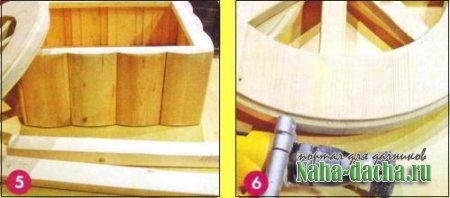5. Изготовьте кузов тележки из реек и досок (быстро и легко «ящичек» можно собрать из шпунтованной доски или блок-хауса). В дне тележки просверлите дренажные отверстия.