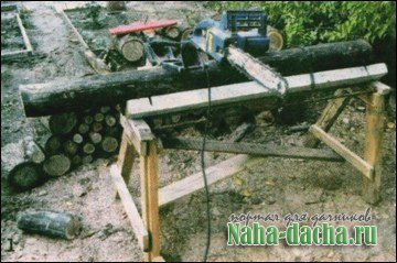 Смастерил специальные козлы, позволяющие пилить бревно до упора: две доски шириной по 30 см с выбранными четвертями (подошли от старой оконной коробки). Соединил их под углом 90 град., прибил к ножкам-распоркам, концы врезал в верхние поперечины (фото 1). Высоту помоста подобрал с расчетом, чтобы бревно при распиливании находилось на уровне согнутого локтя.