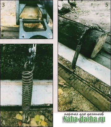 Еще одно приспособление помогает прижать место распила с обеих сторон. Например, в кривых бревнах. Прихватка состоит из бракованной цепи бензопилы, соединенной с пружиной на растяжение (фото 4-5). С обеих сторон продольных досок козлов я протянул штанги из прутка <3 16 мм. А к свободным концам цепи и пружины приделал кольцо и крючок соответственно. За кольцо прикрепил цепь к одной штанге. Во время работы перекидываю цепь через бревно и, натянув пружину, цепляю крючком за вторую штангу — бревно прижимается к доскам. По мере его укорачивания цепь передвигаю.