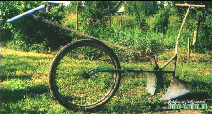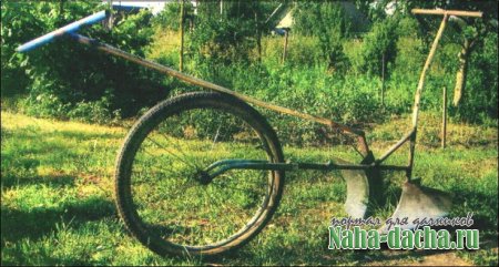 Распашник. Использую для обработки картофельных и свекольных грядок. Его конструкция столь легка и удобна, что позволяет, толкая перед собой, в одиночку окучивать междурядья даже женщине. Сошник сварен из стального листа толщиной 1,5 мм, с обратной стороны укреплен перемычкой. Колесо имеет оптимальный диаметр (26 дюймов) и широкий протектор, поэтому не вязнет в земле. Высоту ручки можно подстроить под конкретный рост человека. Велосипедная вилка соединена с горизонтальной перекладиной болтом. Отвинтив его, можно перекинуть вилку на 180 град. Это позволяет изменить угол приложения усилия — в зависимости от тяжести почвы. Глубина прополки — до 20 см, регулируется исключительно силой давления на рукоятку.