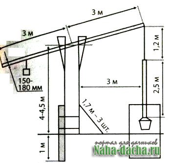 На нижний конец балансира вешают груз-противовес. На верхний конец крепят с помощью отрезка цепи или троса шест. Его длина - отверха оголовка до уровня воды в колодце. К концу шеста крепят ведро.