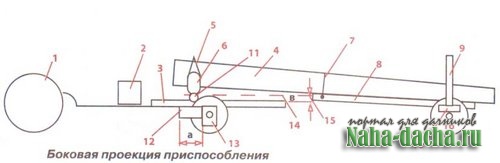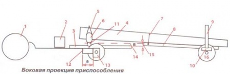 1 — мотоблок, 2 — ящик-сиденье, 3 — рама прицепа (левое колесо условно не показано), 4 — груз, 5 — крепление груза к поворотной части, 6 — поворотная деталь шкворневого узла, 7 — фиксация к дышлу задних колес, 8 — продольная балка дышла, 9 — штыри, 10 — основание дышла, 11 — нижняя деталь шкворневого узла, 12 — уголки крепления, 13 — балка крепления колес прицепа, 14 — гибкая сцепка, 15 — зазор (необходим для преодоления впадин), 16 — жесткие колеса