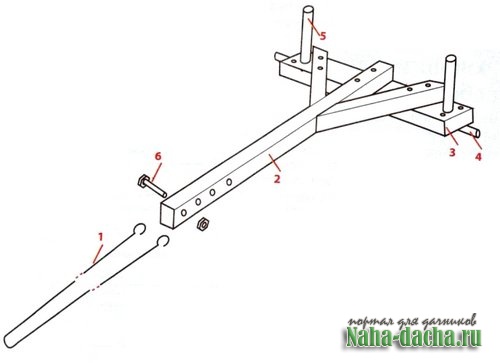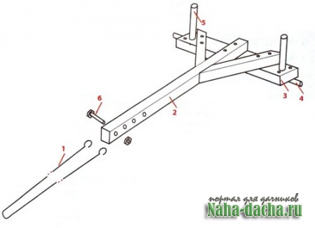 тяга к мотоблоку Рис. 2 Конструктивная схема дышла 1 — проволока (соединяет шкворнь и дышло), 2 — продольная балка дышла, 3 — доска для крепления оси колес, 4 — ось, 5 — ограждающие штыри, 6 — болт крепления проволоки