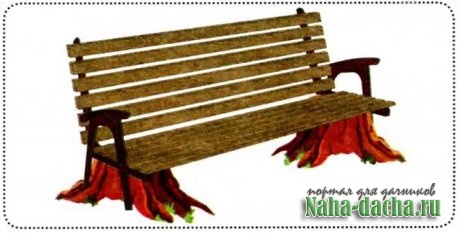 скамейкаСкамью легко смастерить из старого кресла или стула. Распиливаем его пополам, устанавливаем боковые стенки у 2 близлежащих пней или опор (или просто вкапываем в землю), врезаем поперечные бруски и набиваем продольные.