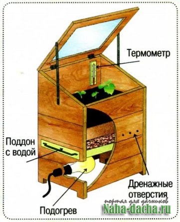 По сути, это деревянный ящик с подогреваемым дном и наклонной прозрачной крышкой. Важно, чтобы стенка ящика, обращенная к солнцу, была вдвое ниже, чем задняя стенка, но при этом имела в высоту не менее 25-30 см. Прозрачную крышку можно изготовить из оконного стекла, оргстекла или поликарбоната.