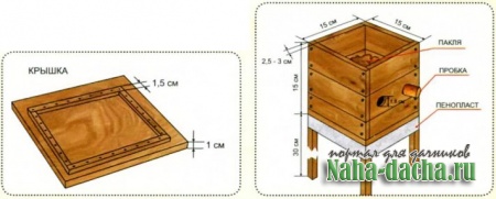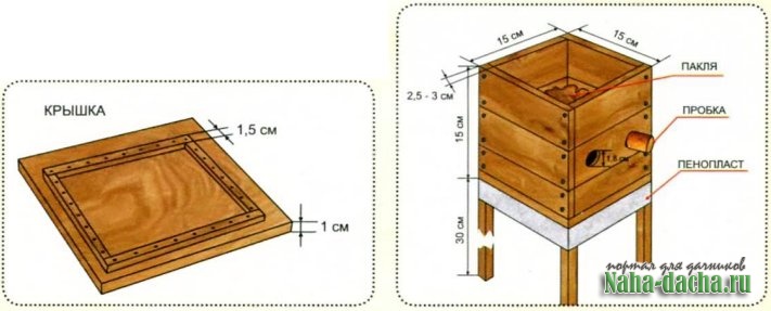 Взял старые неотесанные доски толщиной 2,5-3 см и сколотил квадратный ящик 15x15x15 см. Выпилил из фанеры толщиной 1 см крышку и дно. Дно к корпусу прибил наглухо. Крышку закрыл в «нахлобучку»: с внутренней стороны по периметру крышки прибил 4 планки сечением 1,5x1,5 см.