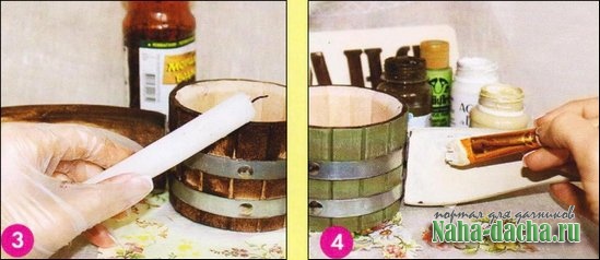 3. Натрем свечой углы и те места ковша, где впоследствии должны появиться потертости. Излишки воска удалим мягкой тряпочкой. 4. Плоской кистью нанесем 1 -2 слоя акриловой краски цвета слоновой кости на ручку, и болотного оттенка - на сам ковш.