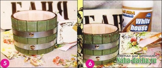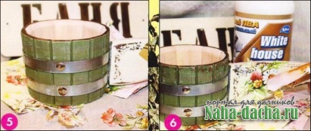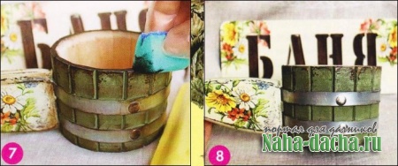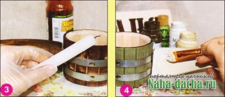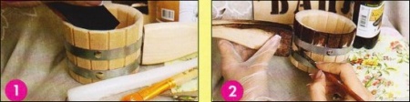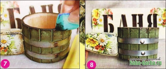 7. Поролоновой губкой нанесем патину по краям, вбивая ее в поверхность. Затем покроем ковш 2 слоями отделочного акрилового лака на водной основе. 8. Наш замечательный ковш готов. С легким паром!