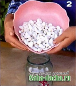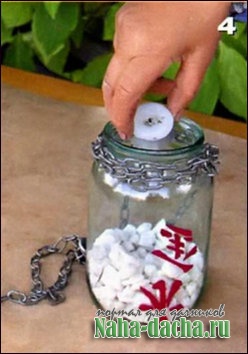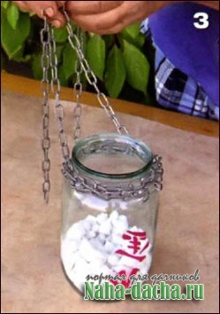 3. Обмотайте цепью горлышко банки, длинные концы цепи выведите наверх, и скрепите карабином. Получится «ручка». 4. Насыпьте в банку белый гравий примерно на 1/3 ее высоты. Поместите на гравий греющую свечу.