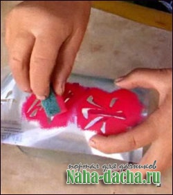 1. Подклейте трафарет к стенке банки. 2. Красной краской с помощью губки набейте иероглифы через трафарет. Высушите.