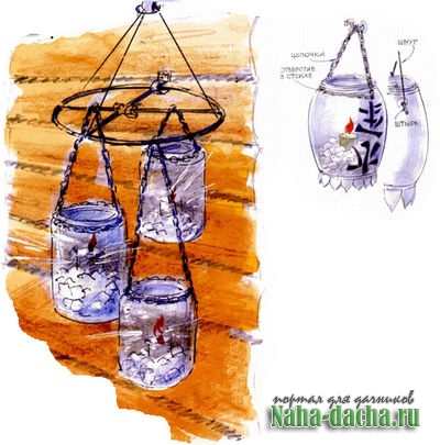 Теперь свечу можно зажечь и подвесить подсвечник на ветку дерева, на крючок на стене беседки,на любую выступающую часть садовой конструкции. Особенно красиво получится, если вы сделаете несколько таких светильников и разместите их по всему саду или же по периметру открытой веранды.