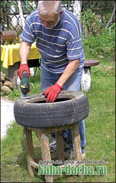 Я изготавливал вазоны из разных шин в зависимости от их расположения. Например, в вазонах, стоящих на земле, основание делал шире, увеличив площадь соприкосновения с грунтом. Вазон, стоящий на невысоком пне, лучше смотрится и более устойчив, если опереть его на автомобильный диск. Правда, перед засыпкой грунтом нужно закрыть его отверстие металлическим листом.