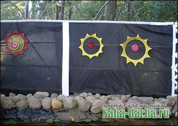 Оставалось изготовить переносной, лёгкий и в то же время привлекательный ограничитель, препятствующий подъезду машин к воротам. Всем этим требованиям отвечает «улитка», также сделанная из шин. Для облегчения конструкции выпилил боковины, а для жёсткости вставил внутр подходящий металлический обруч от бочки. Шею «улитки» (с головой) прикрепил к туловищу шурупами.