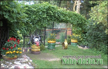 Отслужившие своё автомобильные шины — материал весьма доступный, их широко используют для создания детских площадок и ограждения от тех же автомобилей. Автошины довольно легки в обработке, из них замечательно получаются разнообразные поделки, украшающие садовые места.