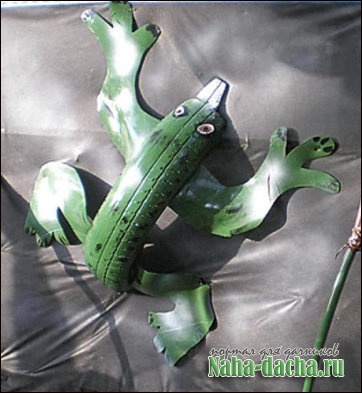 «Лягушка», сидящая на заборе, тоже не требует много времени на изготовление. Для её тела достаточно около трети шины. Для начала выпилите электролобзиком или обрежьте ножом её боковины. Голову удобней выпилить болгаркой с кругом по металлу. Лапы вырезаны ножницами из автомобильной камеры. Глаза — из отходов пластиковых панелей — прикрепил саморезами к туловищу.