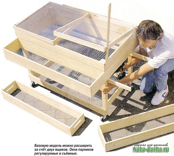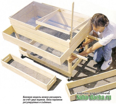 мобильный парникДля двух окошек парника потребуется акриловое стекло толщиной 4 мм. Его фиксируют на рейках рамы винтами со сферической головкой. Под винты предварительно просверливают отверстия 04 мм. Две опорные рейки скругляют на концах и в них с интервалом 50 мм делают отверстия, позволяющие регулировать положение окна. Это особенно важно в жаркую погоду, когда парник нуждается в проветривании. Окна к рамной конструкции крепятся на шарнирах, что позволяет просто снимать их, когда они не нужны. Так бывает в разгар лета или когда растения становятся слишком высокими. Однако если вы выращиваете какие-то слишком теплолюбивые экзотические растения, окна и летом будут обеспечивать им необходимую защиту.