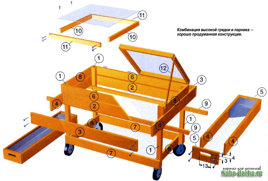 То, что здесь речь идёт не о традиционной «высокой грядке», ясно с первого взгляда. Ведь обычно она сооружается на земле и состоит из нескольких последовательно уложенных слоёв — сучьев, соломы, листвы и прочих биологических остатков. В нашем случае грядка также располагается высоко, но в ней используется готовый культурный субстрат, купленный в садовом центре. И ещё одно отличие: наша грядка — на колёсах, и потому может менять своё положение, переезжая при необходимости на солнце или в тень. Кроме того, у неё есть окна, которые можно переставлять или полностью снять. Рамная конструкция позволяет превратить грядку в парник. Для этого используют два отдельных посадочных ящика, если потребуется больше места, например, когда пора прореживать весенние посевы или когда подросшие растения должны уступить место новой рассаде.