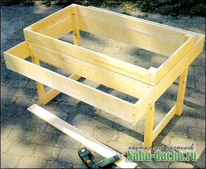 Дно состоит из проволочной сетки, прибитой к деревянной раме. Деревянные детали конструкции грядки-парника защищают прудовой плёнкой, которую крепят с помощью реек, скоб и гвоздей. Чтобы в дальнейшем излишки воды могли стекать, в плёнке нужно предусмотреть перфорацию.
