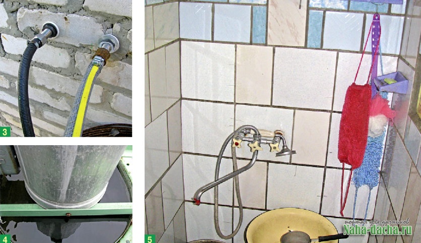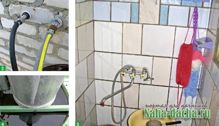 Для установки крана отбора горячей воды использовал отрезок трубы с резьбой диаметром 1/2". Просверлил в баке отверстие как можно ниже уровня нагревателя и закрепил трубу гайками с двух сторон через резиновые прокладки. На трубу установил вентиль. К нему присоединил шланг, по которому горячая вода поступает в моечное отделение бани (фото 2).