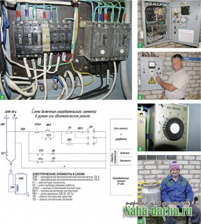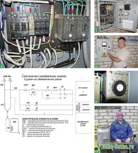 бойлер своими рукамиДля ручного и автоматического включения нагревателя я разработал электрическую схему (см. рисунок). Жирные линии — это силовая цепь, тонкие — схема управления пускателем.