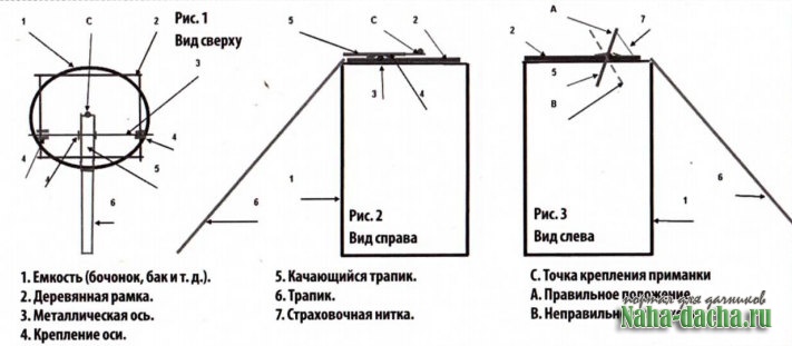 (рис. 3).Осталось только отрегулировать чувствительность мышеловки. Трапик 5 должен опрокидываться, если на его край (точка С) положить небольшой вес, а потом возвращаться в начальное положение. Все остальное видно на рисунках и фотографиях. Размеры деталей подбираются в зависимости от размеров емкости.