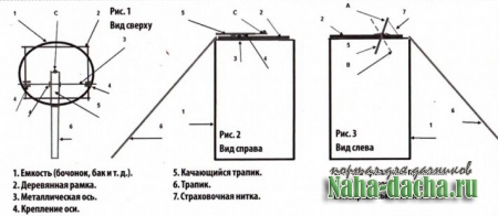 Изготовить мышеловку очень просто. Берем четыре планки и делаем рамку 2. Устанавливаем ее на емкость 1. Вырезаем четыре узкие полоски из металлической банки. Берем деревянную планку 5 и на ее середине двумя полосками металла закрепляем ось 3 так, чтобы она свободно, но без люфта вращалась. Потом еще двумя полосками металла закрепляем ось 3 к рамке 2. Трапик 6 крепится к горловине емкости по месту. В зависимости от ширины трапик можно прикрепить одной металлической широкой полоской или двумя узкими.