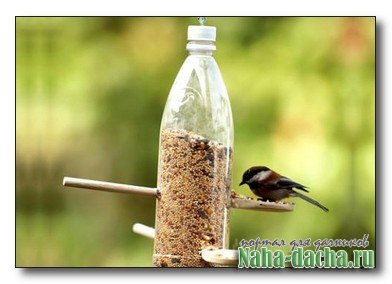 Засыпать зерно в кормушку удобно совком, который вырезал опять же из пластиковой 1,5-литровой бутыли. Если вы захотите сделать аналогичную кормушку, то мою простую конструкцию, в том числе и совок, можете выполнить по-своему.
