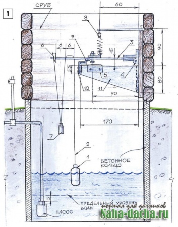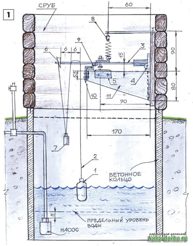 рис. 1 представлена простая конструкция, в которой исключена возможность понижения уровня воды в колодце ниже предельно допустимого значения. Поплавок 1, прикреплённый тонким шнуром (или обычной рыболовной леской) 2 со скользящим по нему грузиком 7, поднимает последний до установленного на шарнире 4 рычага 3. Дальнейшее опускание поплавка приведёт к нагрузке и повороту подвешенного на пружине 8 рычага и размыканию контактов выключателя 5, который стоит в цепи управления электропитанием насоса, и, в конечном результате, к остановке насоса. Если уровень воды в колодце повысится, то поплавок начнёт всплывать, а грузик — опускаться. В результате пружина поднимет рычаг от нижнего упора к верхнему, и насос включится.