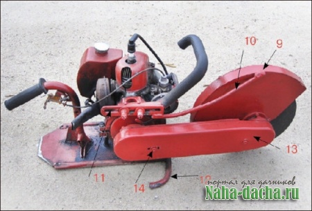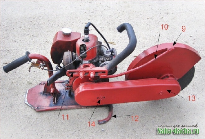 Сварной защитный кожух 9 для диска пилы зафиксировал прутом 10 на кронштейне 11 крепления двигателя. К площадке спереди приварил опорную дугу 12. Натяжение ремня (внутри защитного корпуса 13) регулирую болтом 14, передвигая его по шлицу.