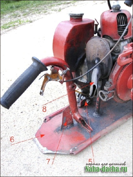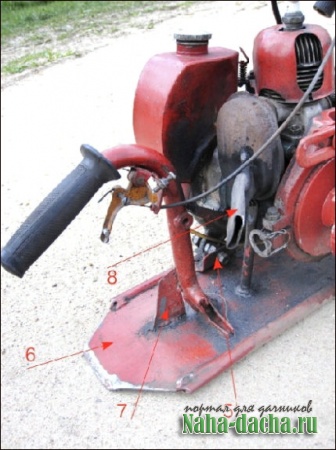 Кожух двигателя прикрепил болтом М10 к «ушку» 5. приваренному к металлической площадке 6 толщиной 2 мм с окантовкой из трубок d 12 мм. Направляющую рукоятку обрезал, приварил и укрепил косынкой 7. Гпушитель нарастил патрубком 8.
