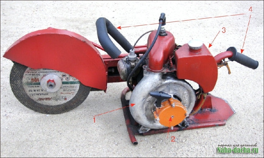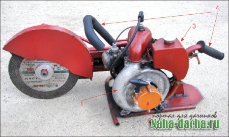 От пилы «Дружба-4» использовал мотор 1 в сборе, стартер 2, бензобак 3, рукоятки 4.