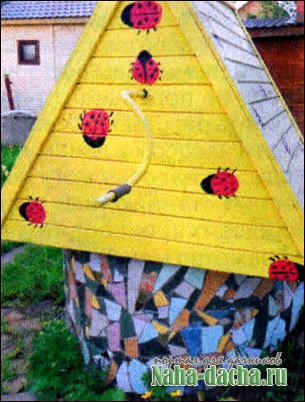 Мысль о том, как украсить колодец, посещала меня давно. Верхнюю его часть я еще в прошлом году разрисовала масляными красками — теперь на желтом фоне по коньку ползают яркие божьи коровки. А в этом году мне представился случай оформить и нижнюю часть колодца, то есть бетонное кольцо.