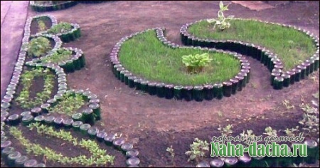 Предприимчивые дачники давно освоили этот замечательный материал для огораживания клумб и грядок. Простейший бордюрчик устанавливается за пять минут, высокие клумбы из бутылок в изготовлении сложнее. Понадобится пустая емкость и цементная смесь, которой вы ее обмажете. Пока цемент не схватился, по периметру ряд за рядом укладывают бутылки, утапливая горлышки в раствор. Можно обойтись без емкости, скрепляя цементом бутылки в районе горлышек.