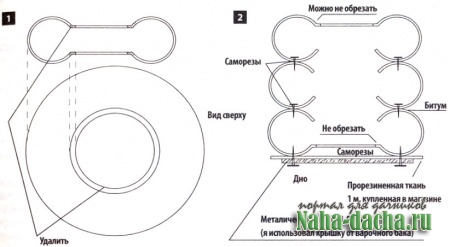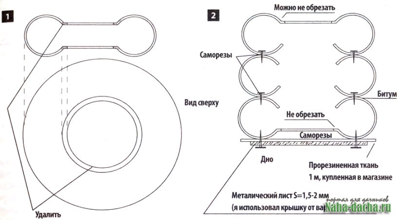 Я сделал из старых покрышек емкость для воды, предназначенной для всяких технических нужд (в том числе и для полива, конечно). На мой взгляд, это очень удобно. Во-первых, обходится все практически даром, ведь брошенные покрышки отыскать несложно. А во-вторых, резиновую «бочку» можно сделать нужного объема, да и сам процесс изготовления совсем не сложен. Что и как - хорошо видно на рисунках, дольше на словах объяснять.