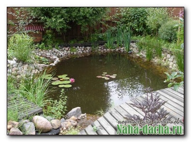 Чтобы правильно выбрать место для пруда, нужно знать несколько правил: солнечные лучи не должны попадать на поверхность воды более чем б часов в сутки, в непосредственной близи озера не должны расти большие листопадные деревья. Выполнение этих требований позволит сохранить воду чистой и прозрачной. Размеры пруда должны быть пропорциональны вашему участку. Глубина водоема обычно от 50 до 150 см, в зависимости от размеров. Более глубокое озеро не промерзает зимой, поэтому водные растения -нимфеи, кубышки и другие, можно оставлять в нем на зиму. Расчет пленки проводится следующим образом: ширина (длина) + 2 высоты + 1 метр на подгиб.