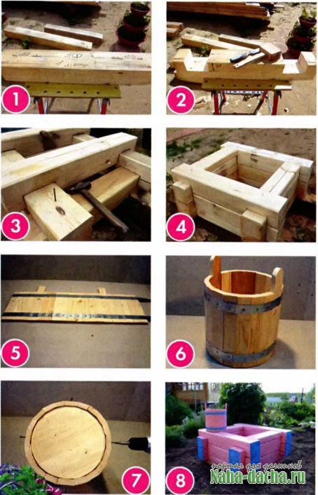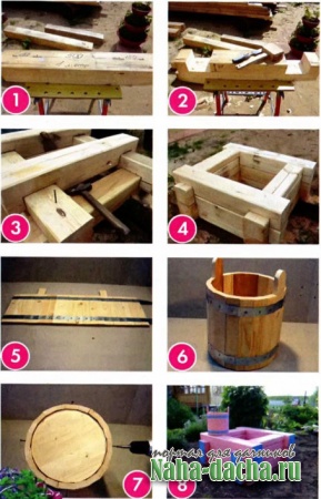 Такой колодец-клумба замечательно смотрится на любом участке и не требует значительных финансовых вложений. Для его строительства вполне подойдут сосновый брус и доски, оставшиеся после возведения бани или дачного домика. Кроме того, этот вариант сруба уместен и для сооружения настоящего колодезного домика. Расчет делается по диаметру верхнего кольца колодца с учетом припусков на диаметр и высоту. Главное, правильно сделать крышку и закрепить ее на петлях. И не забудьте тщательно обработать все деревянные элементы защитным составом! Помните: спилы поперек волокон и швы между бревнами особенно сильно впитывают воду.