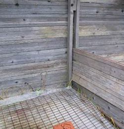 Центральную поперечную и две фронтальные стенки двухсекционного компостера делают разборными, чтобы их можно было наращивать в процессе закладки компостируемой массы.В упрощённом варианте используют не ёмкость, а щиты. В землю вкапывают 4 столба (по углам квадрата) и с трёх сторон стенки зашивают досками или обтягивают сеткой. Фронтальную стенку делают разборной — обычно из горизонтально расположенных досок, оставляя снизу щель высотой 20-30 см. По мере добавления новых порций растительных остатков фронтальную стенку наращивают.