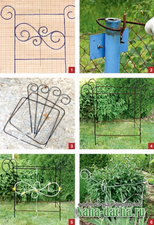 Изготовив первую опору, мы решили сделать еще одну, другой формы. Согнули вокруг бочки несколько окружностей, ножки с «барашками» сделали такими же, как у первой опоры, соединили и выкрасили в серый цвет - он подойдет розовому пиону и будет не очень заметен в зелени листвы