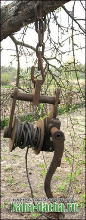 Данное приспособление использую для подъема и спуска центробежного насоса типа «Кама» («Агидель»), которым откачиваю поду из канализационного колодца, а также для других работ, требующих подъема тяжестей.