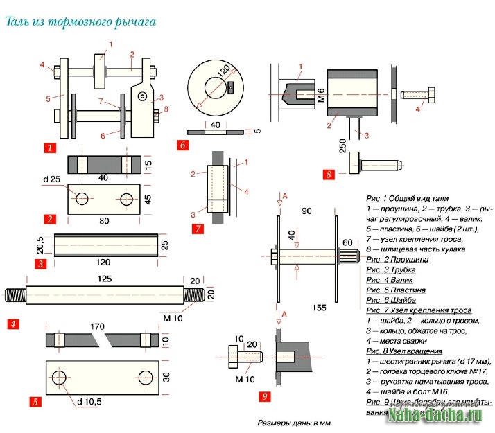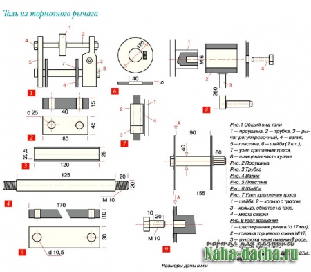 На сайте «Наша дача» неоднократно читал про самодельные приспособления для поднятия грузов. У всех них есть, конечно, плюсы. Но мой самый лучший. Хочу предложить свой вариант ручной тали, которую сделал из тормозного рычага грузового автомобиля Зи/1-130. В машине он служит для подвода колодок с накладками к тормозному барабану, т.е. для уменьшения зазора между ними. Чтобы воспользоваться моей разработкой, нужны навыки токарных и электросварочных работ (или придется обратиться к специалистам).