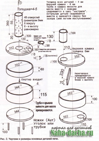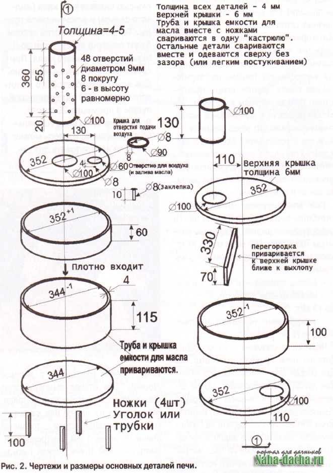 рис. 2. Для сборки можно использовать обычную дуговую электросварку. После завершения сварки нижний резервуар (ёмкость для жидкого топлива) необходимо обязательно проверить на герметичность, заполнив его водой и поставив на несколько часов на лист чистой бумаги либо (что ещё лучше) используя меловую обмазку и керосин.