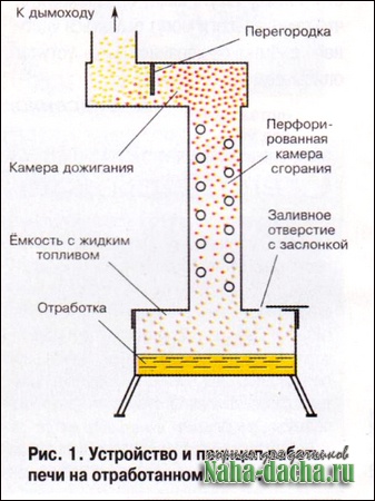 Принцип работы печи. Примерно через 5 минут после розжига печи верхний слой топлива (масла) в нижнем резервуаре закипает, и его пары начинают поступать в камеру сгорания с перфорированными стенками, в которой происходит обогащение паров кипящего масла кислородом для оптимального горения. В установившемся режиме продукты горения поднимаются из камеры сгорания вверх и попадают в камеру дожигания, а затем по дымоходу выбрасываются в атмосферу. Стенки камеры дожигания во время работы печи в штатном режиме имеют самую высокую температуру - это основной источник тепла, поступающего в помещение. Верхнюю плоскую поверхность камеры дожигания можно использовать как плиту для подогрева воды или приготовления пищи.