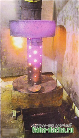(рис. 1): нижней части - резервуара для топлива; средней части -камеры сгорания, обогащающей пары топлива кислородом; и верхней части -камеры дожигания. В съёмной крышке нижнего резервуара печи расположено отверстие для заливки топлива, которое закрывается поворотной заслонкой. Оно выполняет те же функции, что и дверка поддувала в обычной дровяной печи - позволяет регулировать подачу воздуха в зону горения и, следовательно, режим и интенсивность горения. Сверху на камере дожигания расположен короткий патрубок, предназначенный для подсоединения к дымовой трубе.