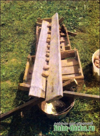 Установив под лотком последовательно три-четыре ящика, начинаем высыпать картофель из ведра в лоток. До нижнего ящика докатываются только крупные клубни, в то время как в верхний попадает исключительно самая мелочь.