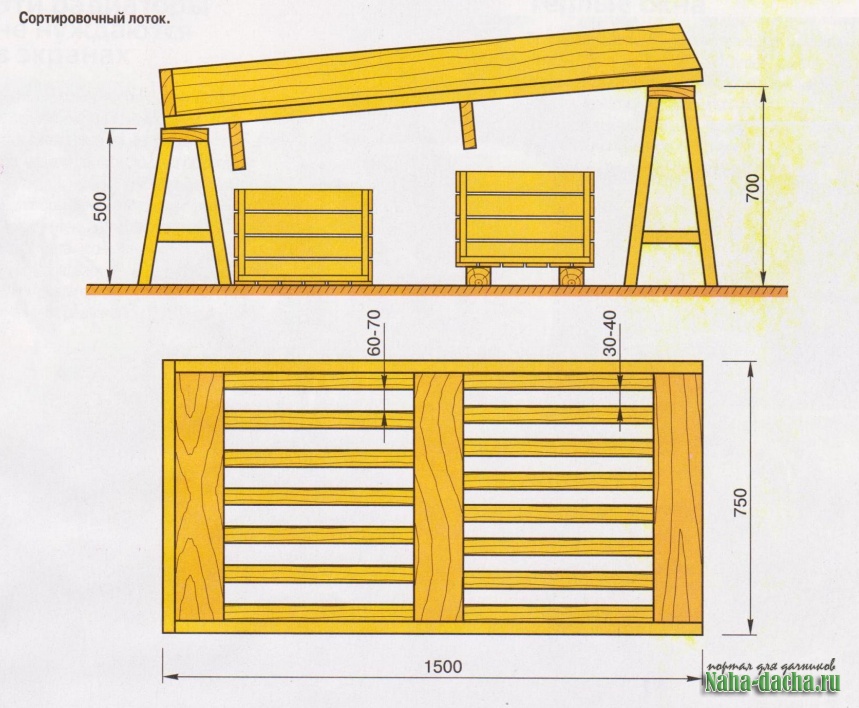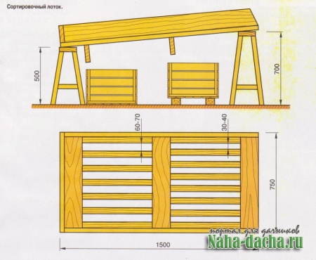 Упростить и ускорить процесс переборки можно, если использовать простейший сортировочный лоток, который состоит из деревянного ящика с решётчатым дном, установленного с небольшим наклоном на невысоких козелках